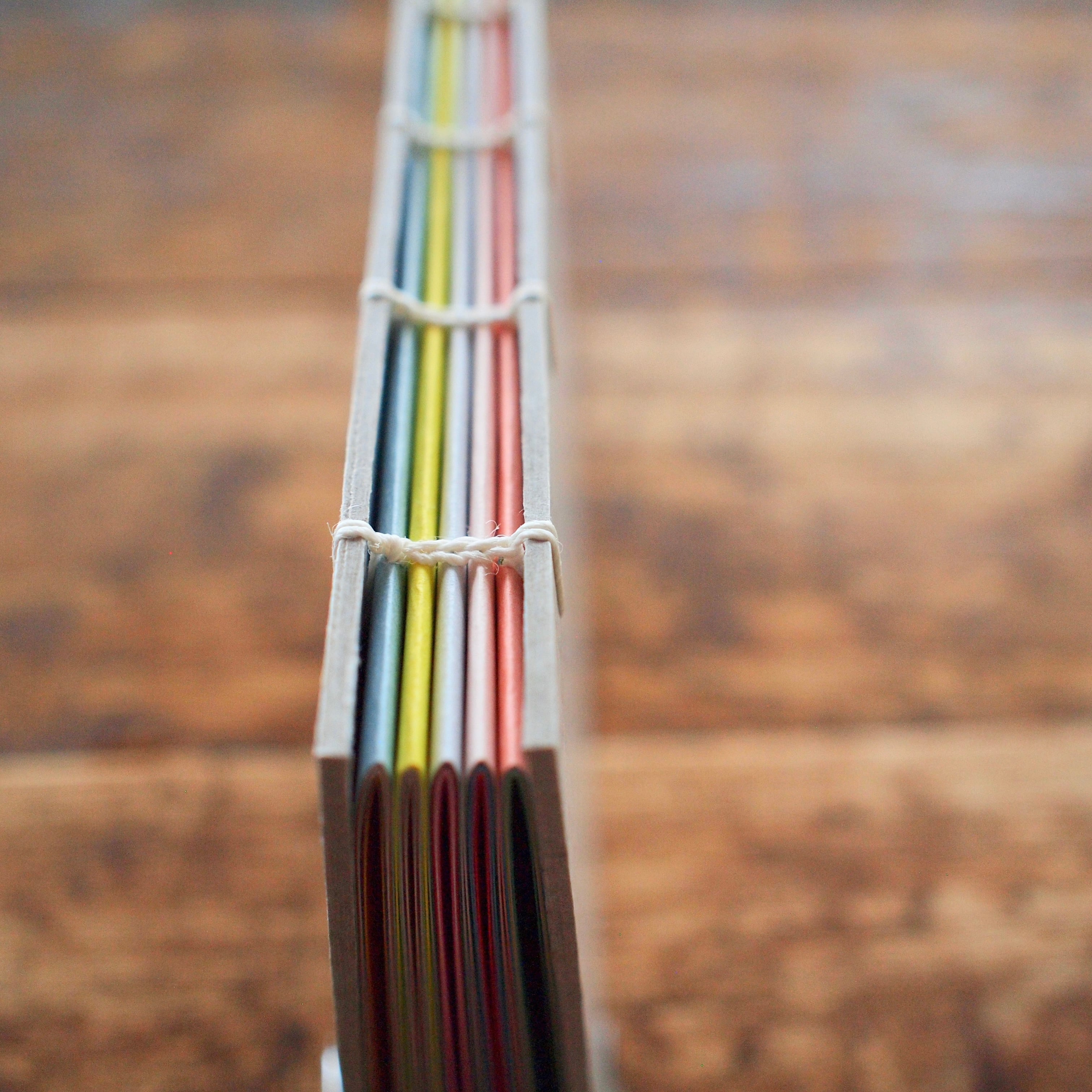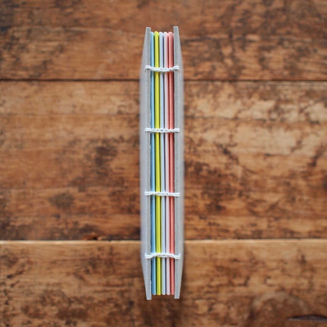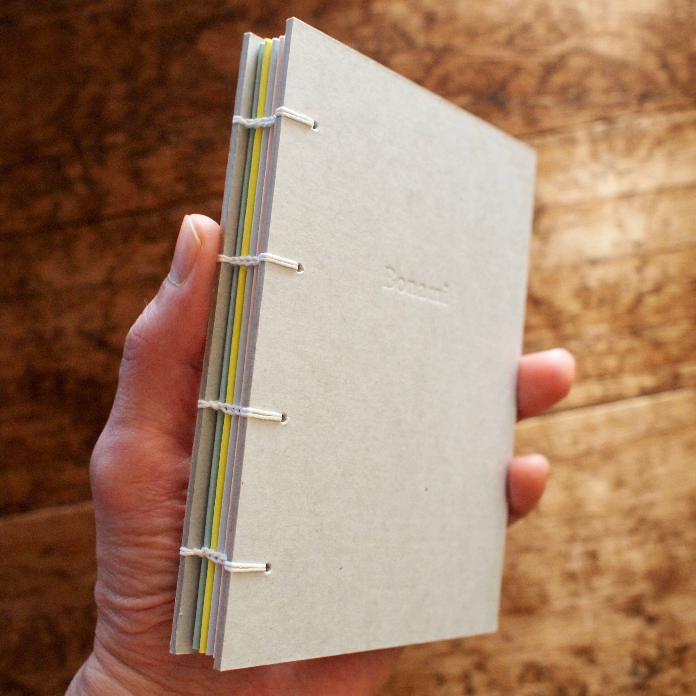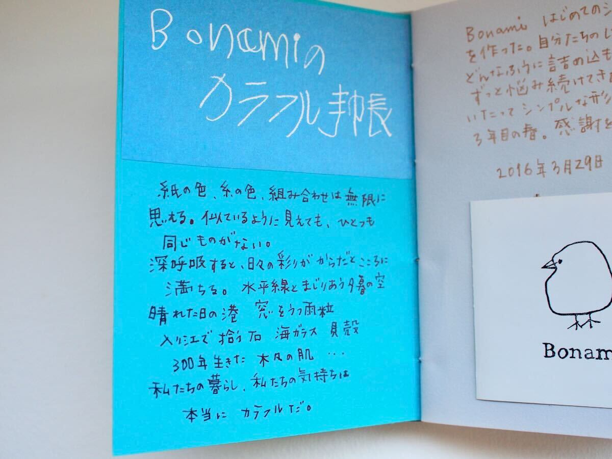 手製本の古典的な技法で綴じられた、Bonamiの「カラフル手帳」(コプティック製本)。