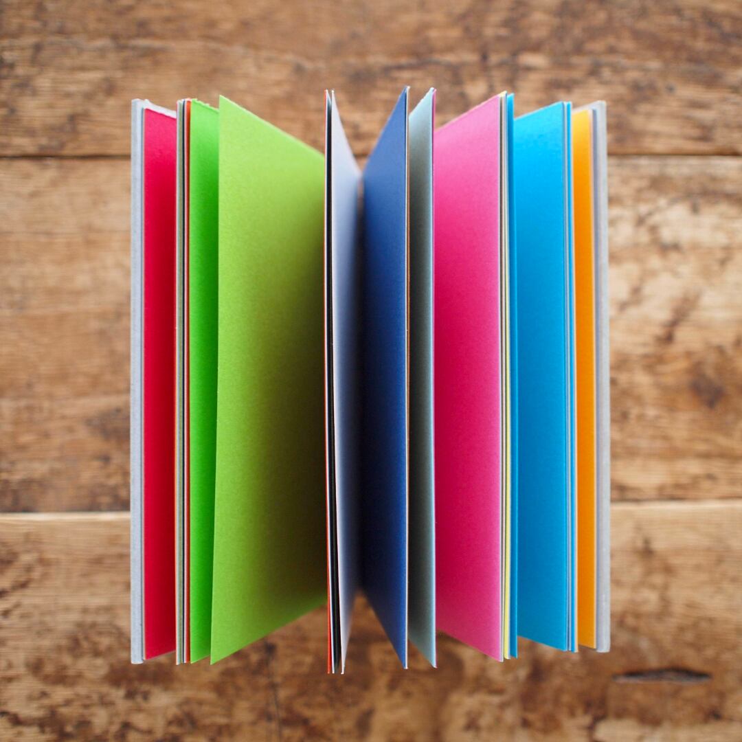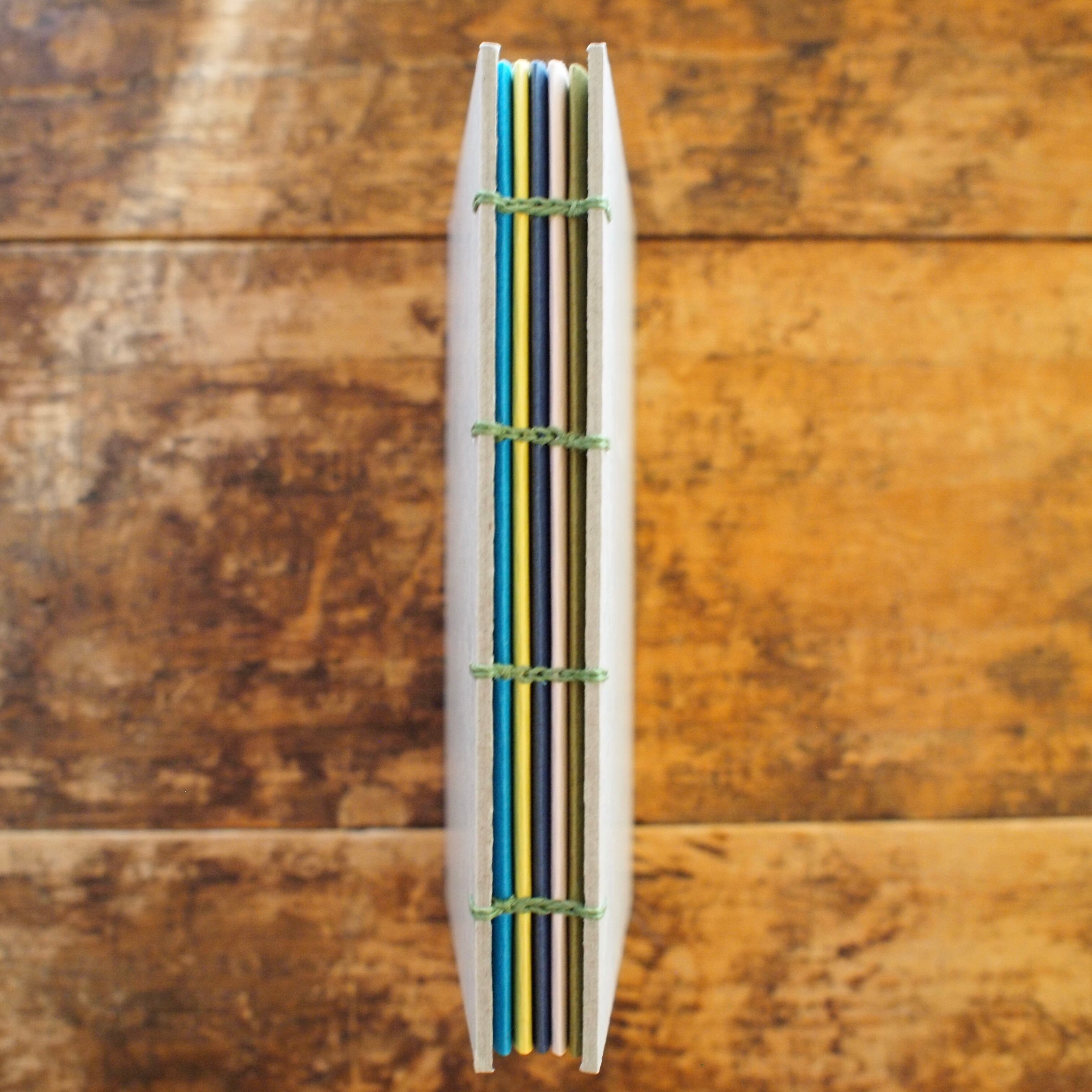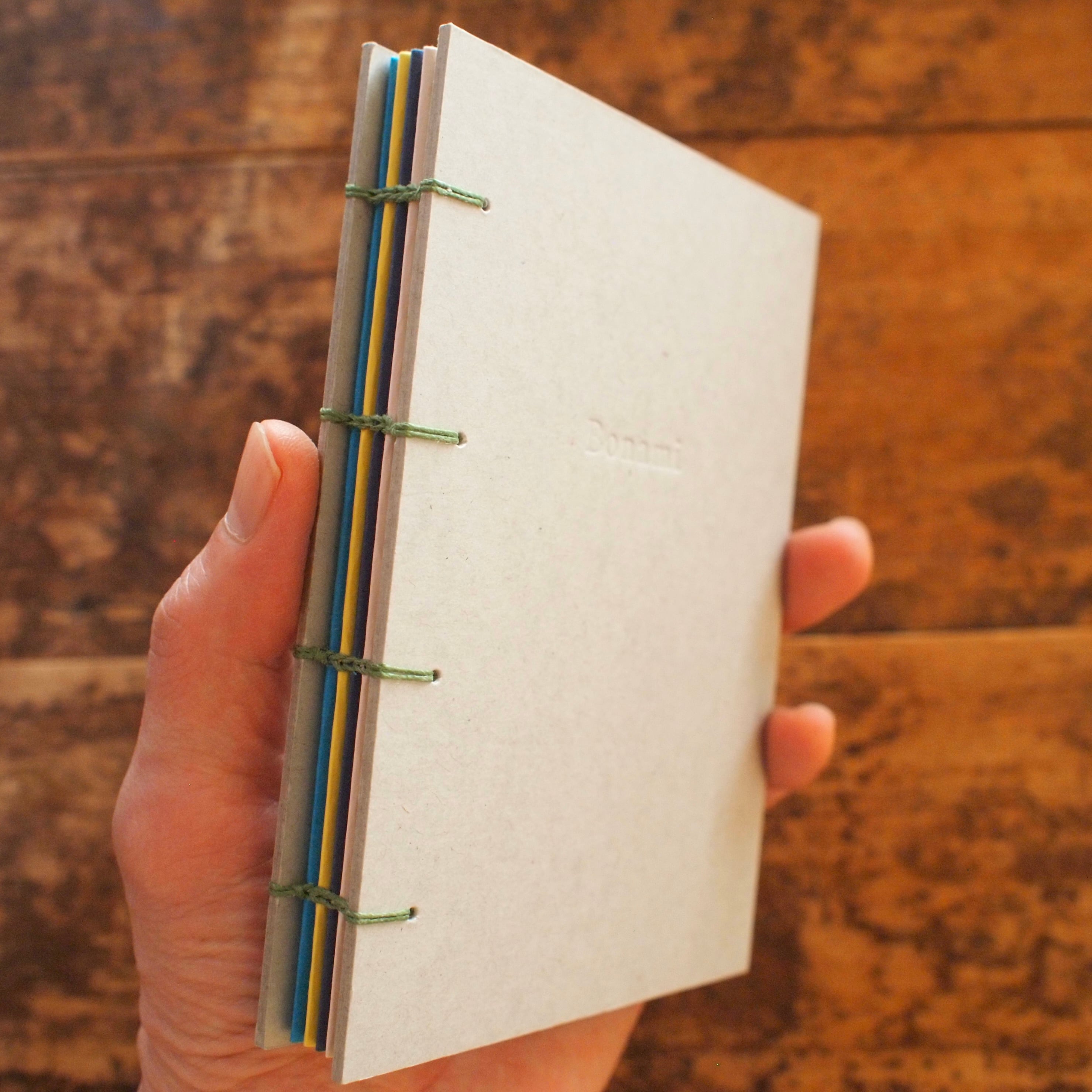 手製本の古典的な技法で綴じられた、Bonamiの「カラフル手帳」(コプティック製本)。