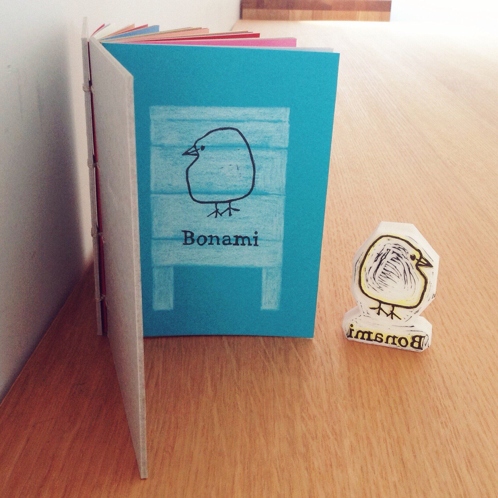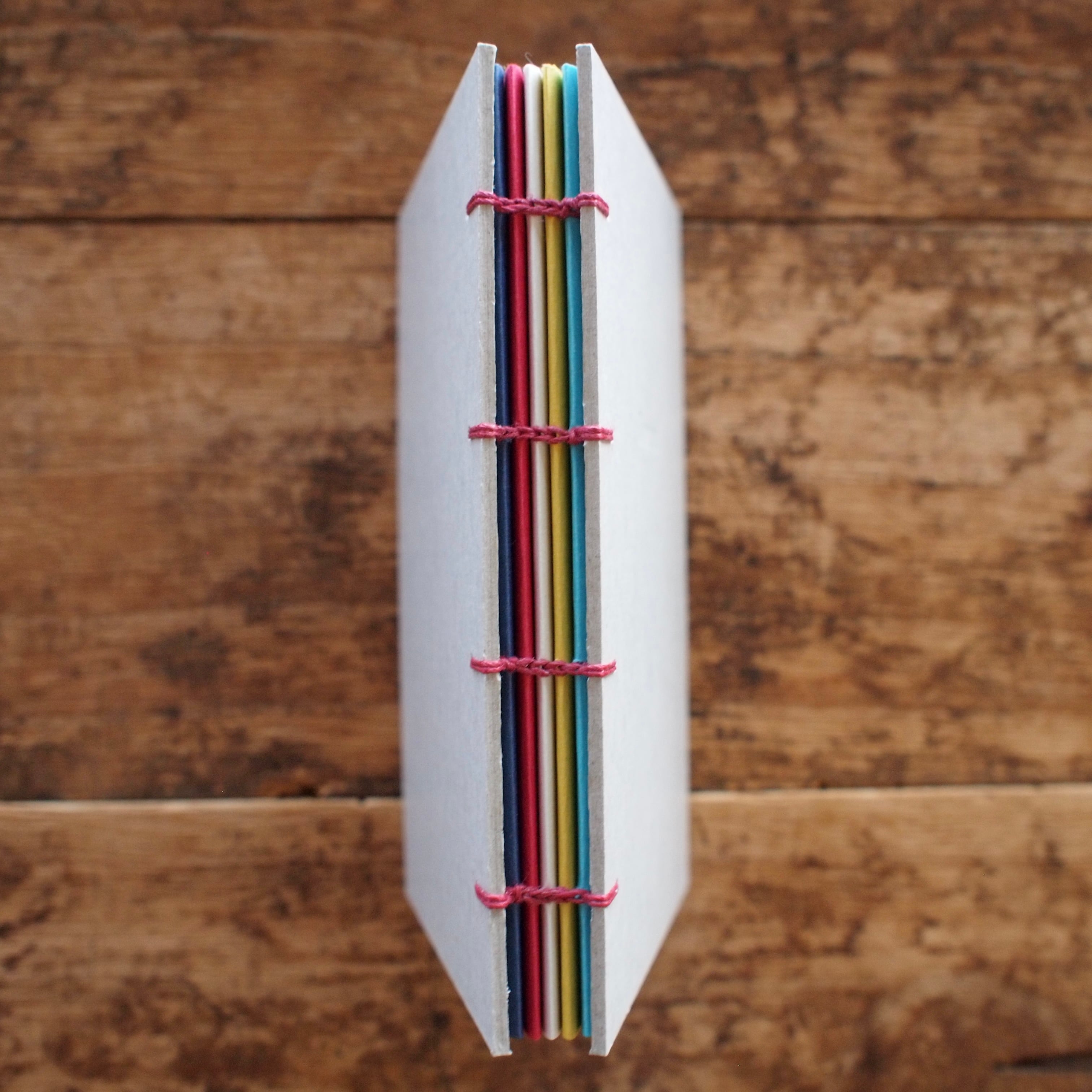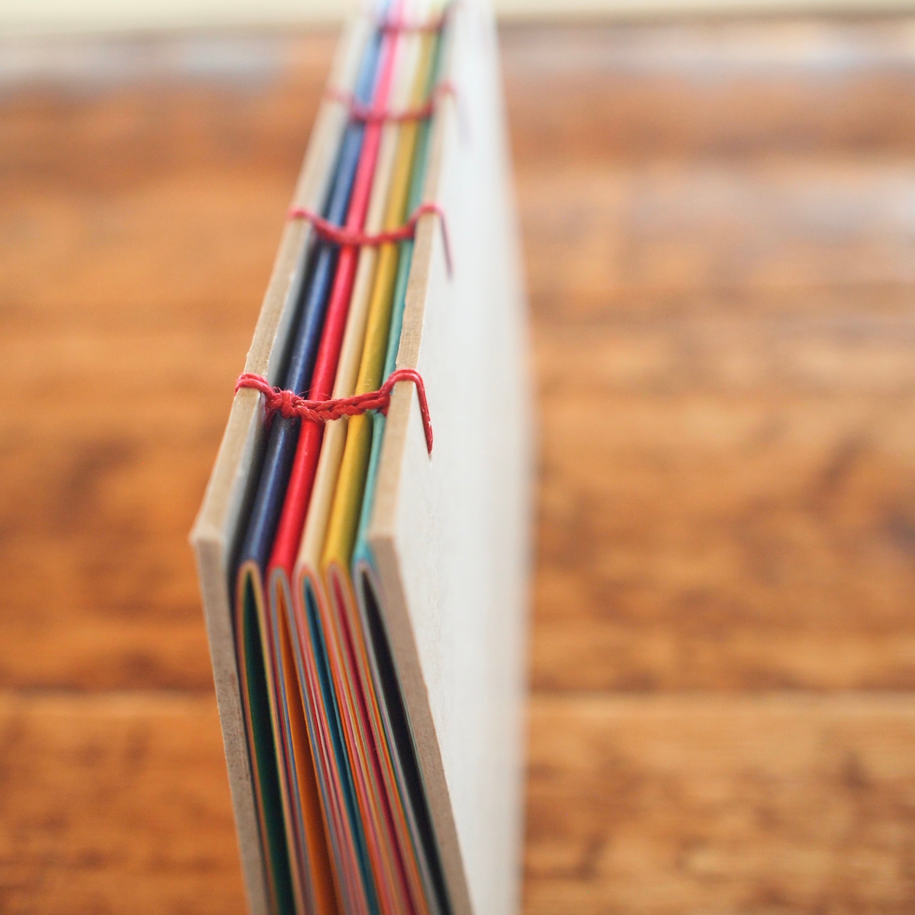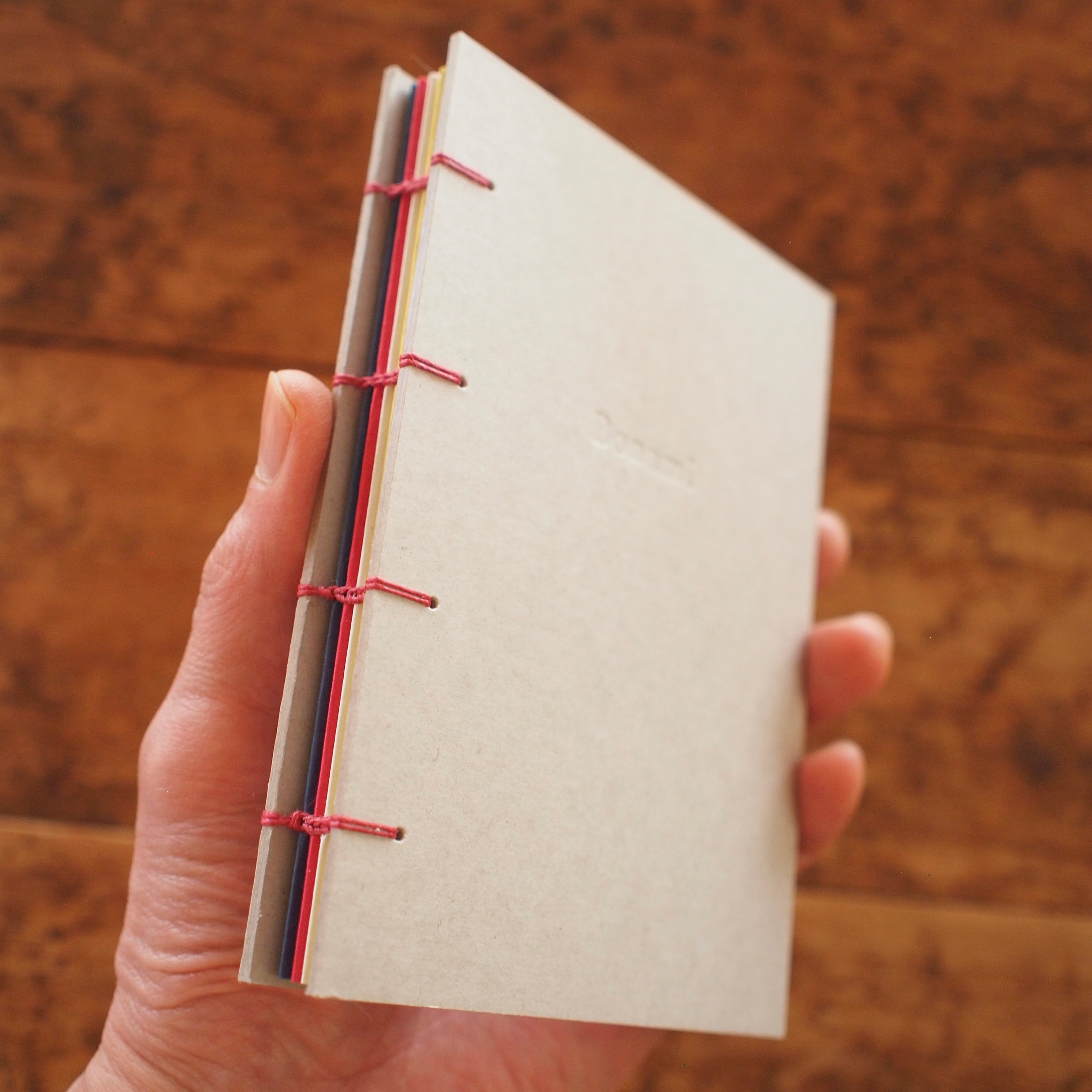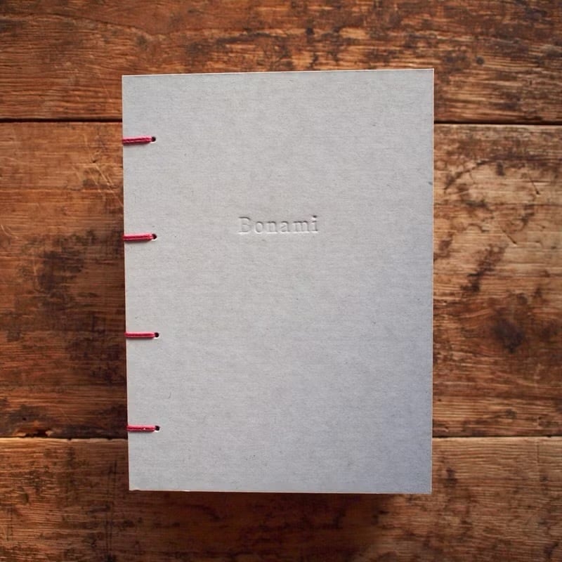 手製本の古典的な技法で綴じられた、Bonamiの「カラフル手帳」(コプティック製本)。